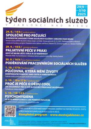 Týden sociálních služeb v Jablonci nad Nisou bude slavnostně zahájen v pondělí 29.9.2025 ve 14 hodin ve vestibulu radnice, kde současně proběhne vernisáž výstavy s názvem SPOLEČNĚ PRO PEČUJÍCÍ. Jste srdečně zváni.