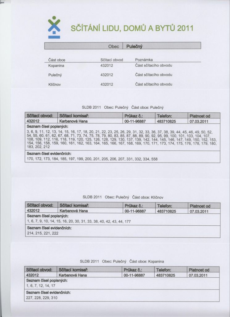 Základní údaje o sčítacích obvodech ( seznam čísel popisných a evidenčních v rámci sčítacího obvodu) na území obce a jméno a příjmení sčítacího komisaře, číslo služebního průkazu a telefonní číslo řídícího pracoviště komisaře.