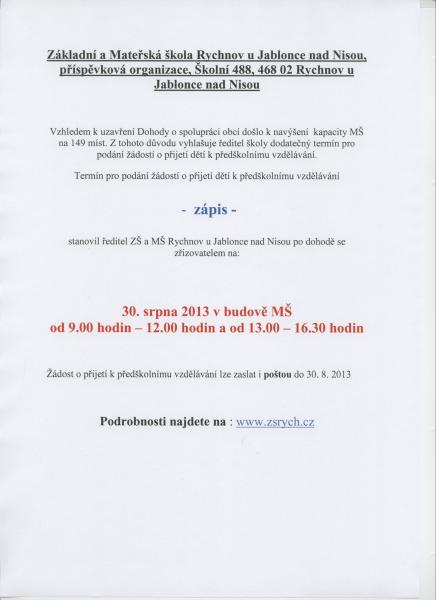 Termín pro podání žádostí o přijetí dětí k předškolnímu vzdělávání - zápis - stanovil ředitel ZŠ a MŠ Rychnov u Jablonce n.N. po dohodě se zřizovatelem na : 30. srpna 2013 v budově MŠ od 9.00 hodin - 12.00 hodin a od 13.00 hodin - 16.30 hodin. Žádost o přijetí k předškolnímu vzdělávání lze uaslat i poštou do 30. 8. 2013.