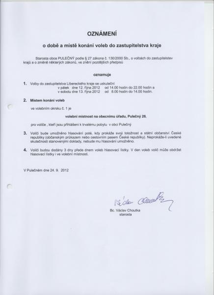 Mistem konání voleb ve volebním okrsku č. 1 je volební místnost na obecním úřadu, Pulečný 26.