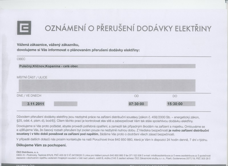 Oznámení o přerušení dodávky eletřiny - 3.11. 2011 od 7.30 hod. do 15.30 hod. 1