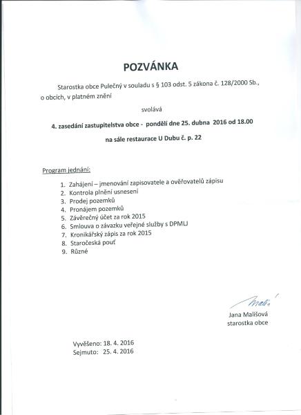 4. zasedání zastupitelstva obce - podělí dne 25. dubna2016 od 18.00 hodin na sále restaurace, Pulečný čp. 22
