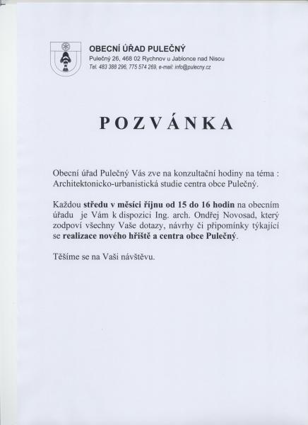 Obecní úřad v Pulečném Vás zve na konzultační hodiny na téma: Architektonicko-urbanistická studie centra obce Pulečný. Každou středu v měsíci říjnu od 15 do 16 hodin na obecním úřadu je Vám k dipozici Ing. arch. Ondřej Novosad, který zodpoví všechny Vaše dotazy, návrhy či připomínky týkající se ralizace nového hřiště a centra obce Pulečný. Vlastní studii si lze prohlédnou též na webových stránkách v rubrice NÁVRH NÁVSI. Těšíme se na Vaši návštěvu.
