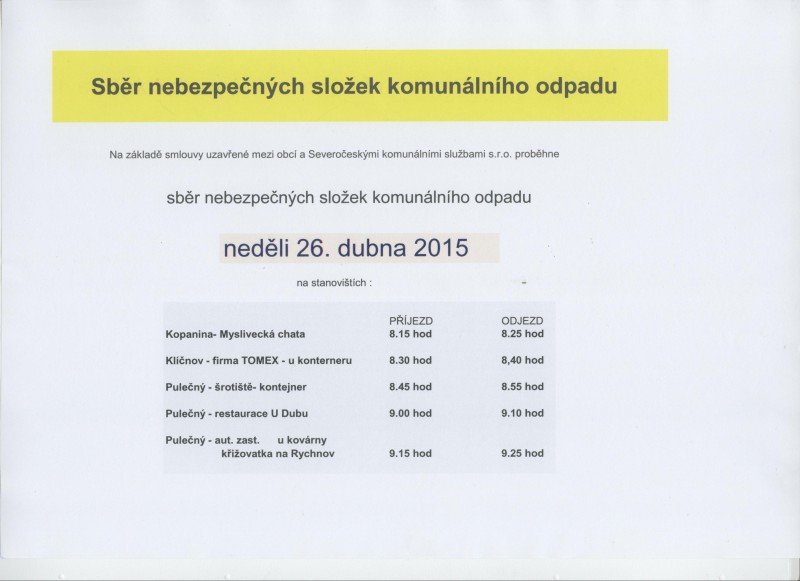 | Pulečný - šrotiště- kontejner | 8.45 hod | 8.55 hod | ||||