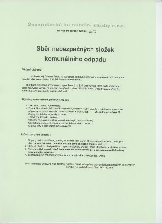 V neděli 17. 4. 2011 se uskuteční ambulantní sběr nebezpečných složek komunálního odpadu.