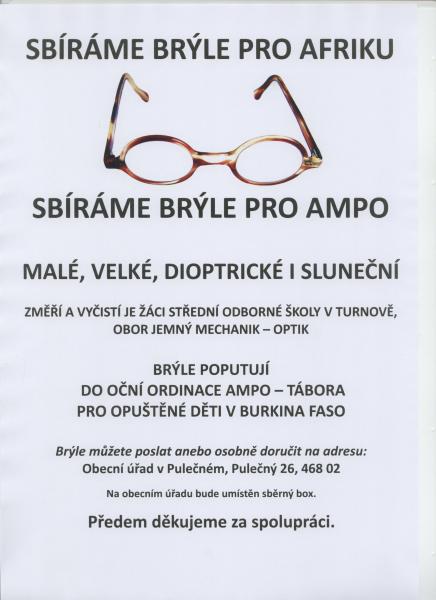 Malé, velké, dioptrické i sluneční můžete poslat nebo osobně doručit na adresu : Obecní úřad v Pulečném, Pulečný 26, 46802 Rychnov u jablonce n. N.