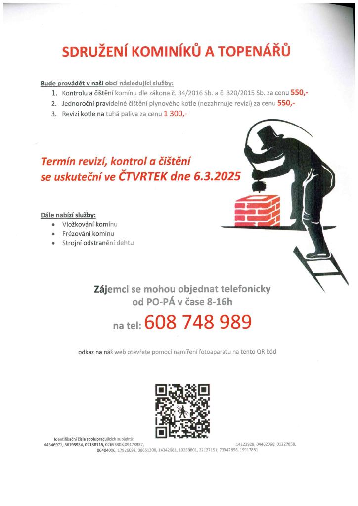 Sdružení kominíků a topenářů budou ve čtvrtek 6. 3. 2025