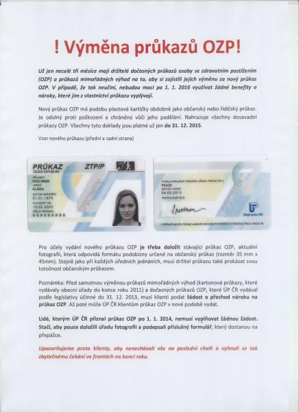 Držitelé dočasných průkazů osoby se zdravotním postižením (OZP) a průkazů mimořádných výhod mají už jen necelé tři měsíce na to, aby si zajistili jejich výměnu za nový průkaz OZP. V případě, že tak neučiní, nebudou moci po 1. 1. 2016 využívat žádné benefity a nároky, které jim z vlastnictví průkazu vyplývají.