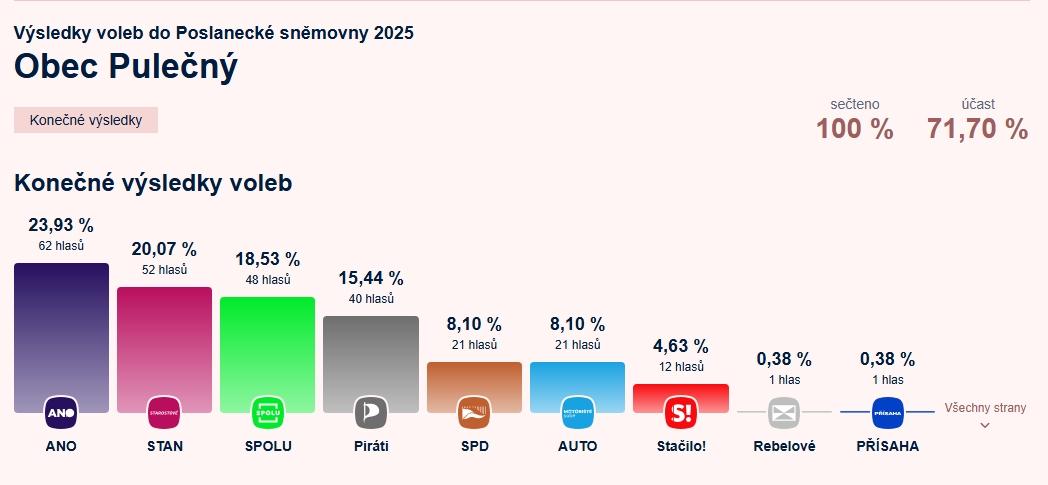 Výsledky voleb do Poslanecké sněmovny ČR konané ve dnech 3. - 4. 10. 2025 v obci Pulečný