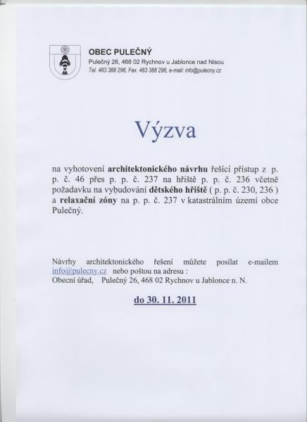 Výzva na vyhotovení architektonického návrhu na vybudování dětského hřiště a relaxační zóny v obci Pulečný 1
