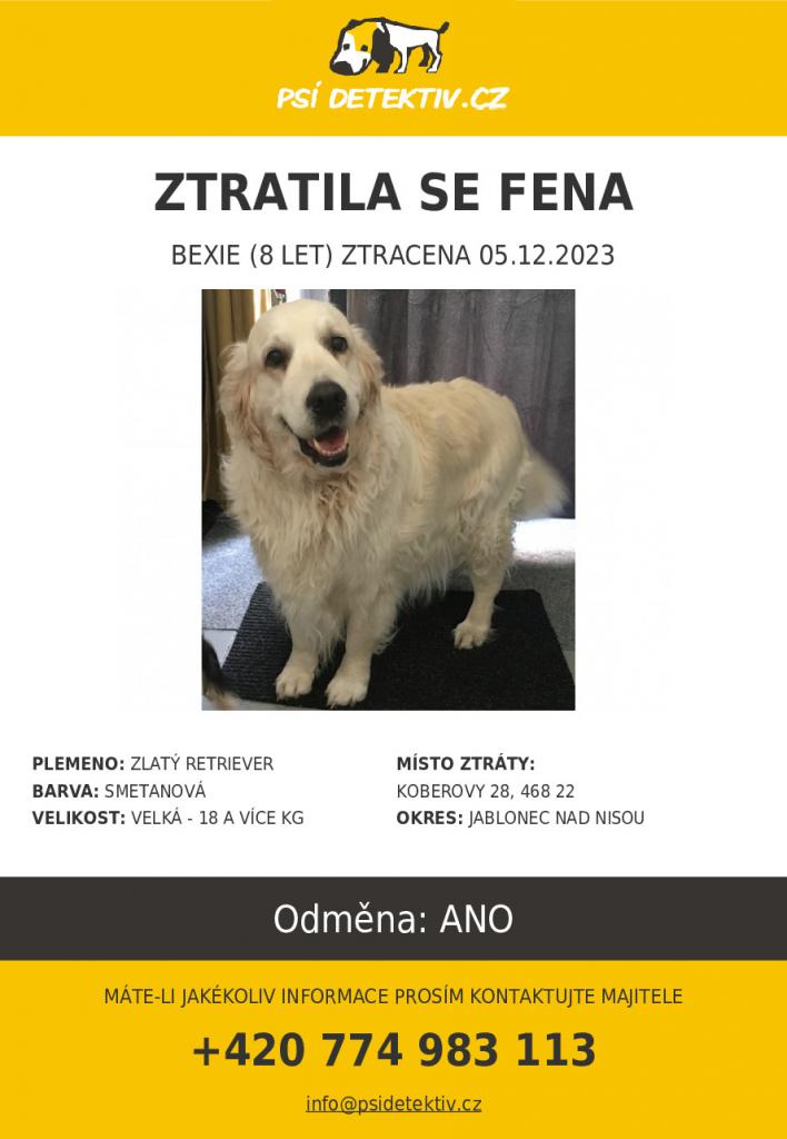 Bexie je 8 let stará fenka zlatého retrievera. Nemá obojek, je čipovaná, kastrovaná a váží asi 40kg. Je nekonfliktní a přátelská. Pokud ji uvidíte, snažte se ji prosím zadržet a kontaktujte majitele na telefon.